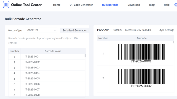 Генерирајте више баркодова скупно из Екцел-а или ЦСВ-а. Бесплатни мрежни генератор више баркодова који подржава кодекс 128, ЕАН-13, УПЦ-А и извозне формате спремне за штампање.